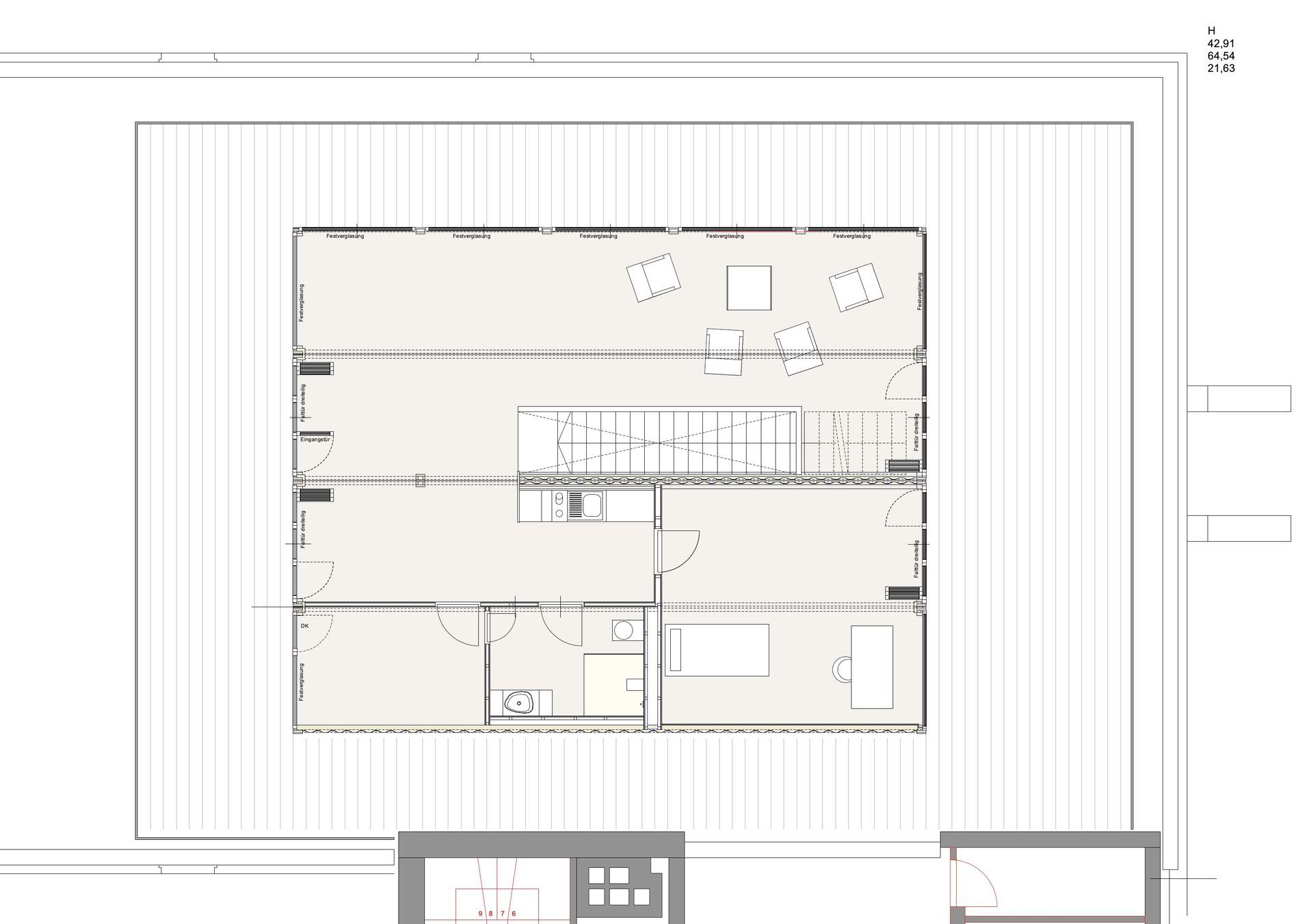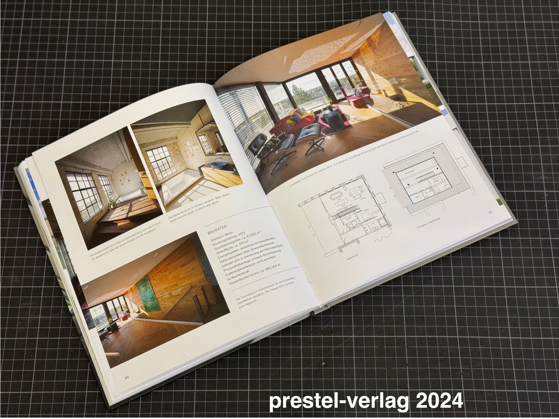 The steel and glass cube on the southern corner of the main building is a new construction made from four converted 40-foot high-cube freight containers with a floor area of 120 m². The well-insulated living space is heated by modern infrared ceiling heating, which draws its energy from photovoltaic elements on the roof of the containers. Automatically controlled external blinds on the façade and the shading of the roof surface by the collectors provide summer heat protection.