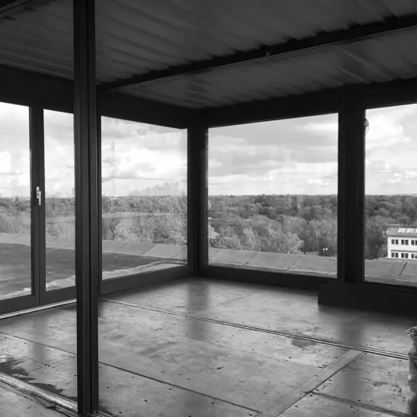 The full-surface glazing all around offers a magnificent view of the city and the surrounding landscape.