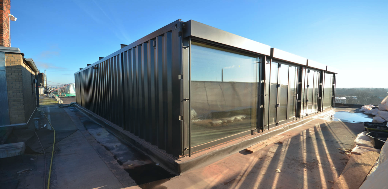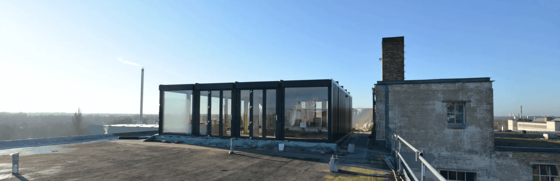 Der Kubus aus Stahl und Glas auf der südlichen Ecke des Hauptgebäudes ist eine neue Konstruktion aus 4 transformierten 40-Fuß-High-Cube Frachtcontainern mit einer Grundfläche von 120 m². Beheizt wird der gut gedämmte Wohnraum mit einer modernen Infrarot-Deckenheizung die ihre Energie aus Photovoltaik-Elementen auf der Dachfläche der Container bezieht. Für sommerlichen Wärmeschutz sorgen automatisch gesteuerte Raffstores vor der Fassade und die Verschattung der Dachfläche durch die Kollektoren.