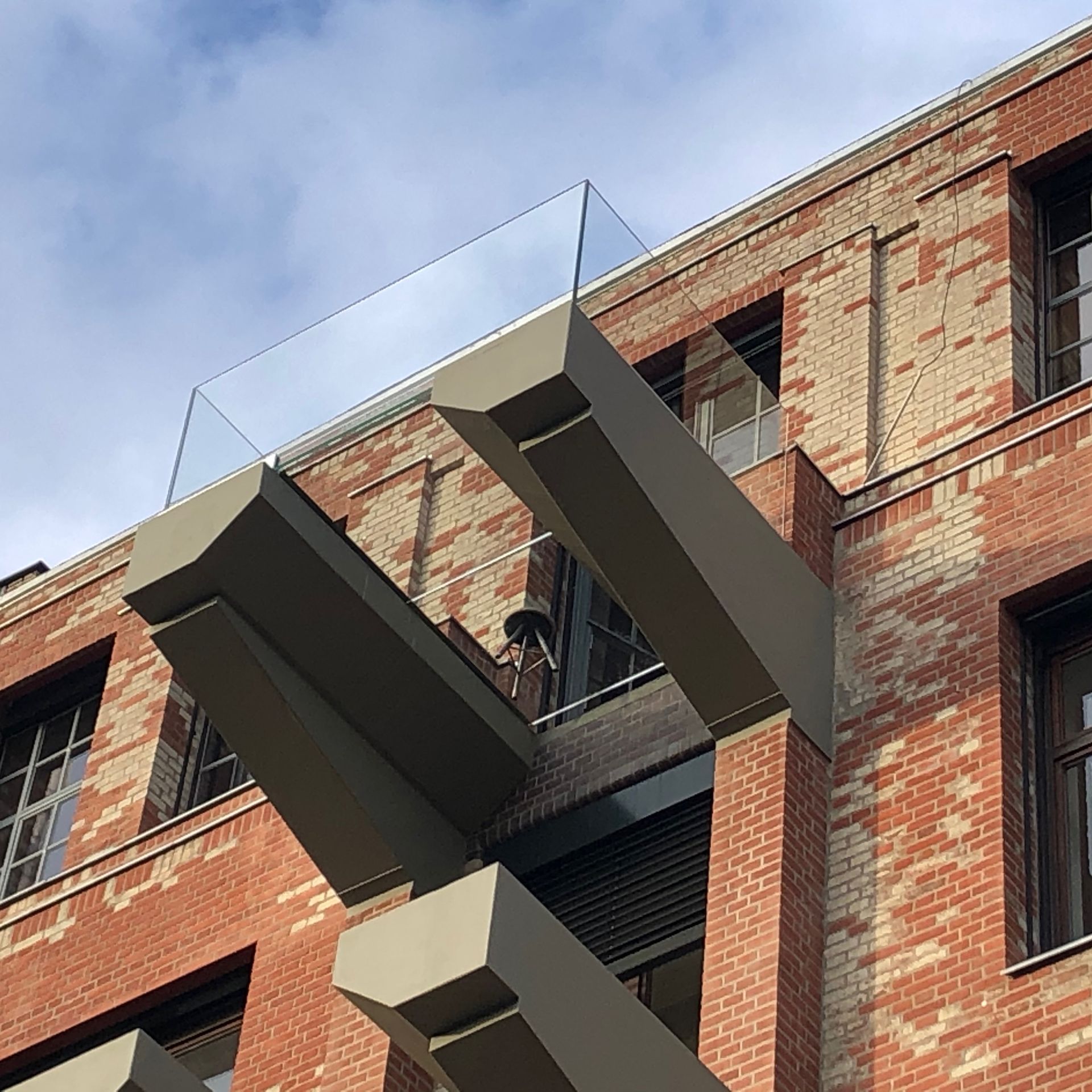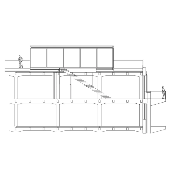 – on the lower level as a loft in the industrial building with a perforated facade, solid, introverted