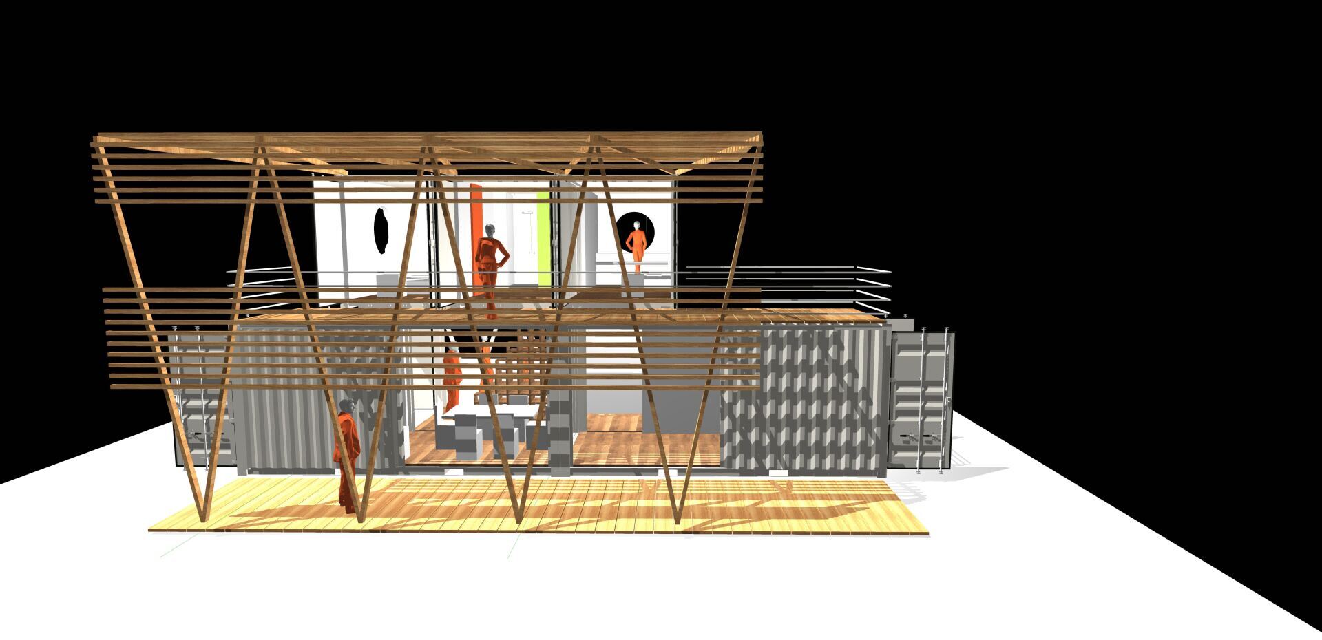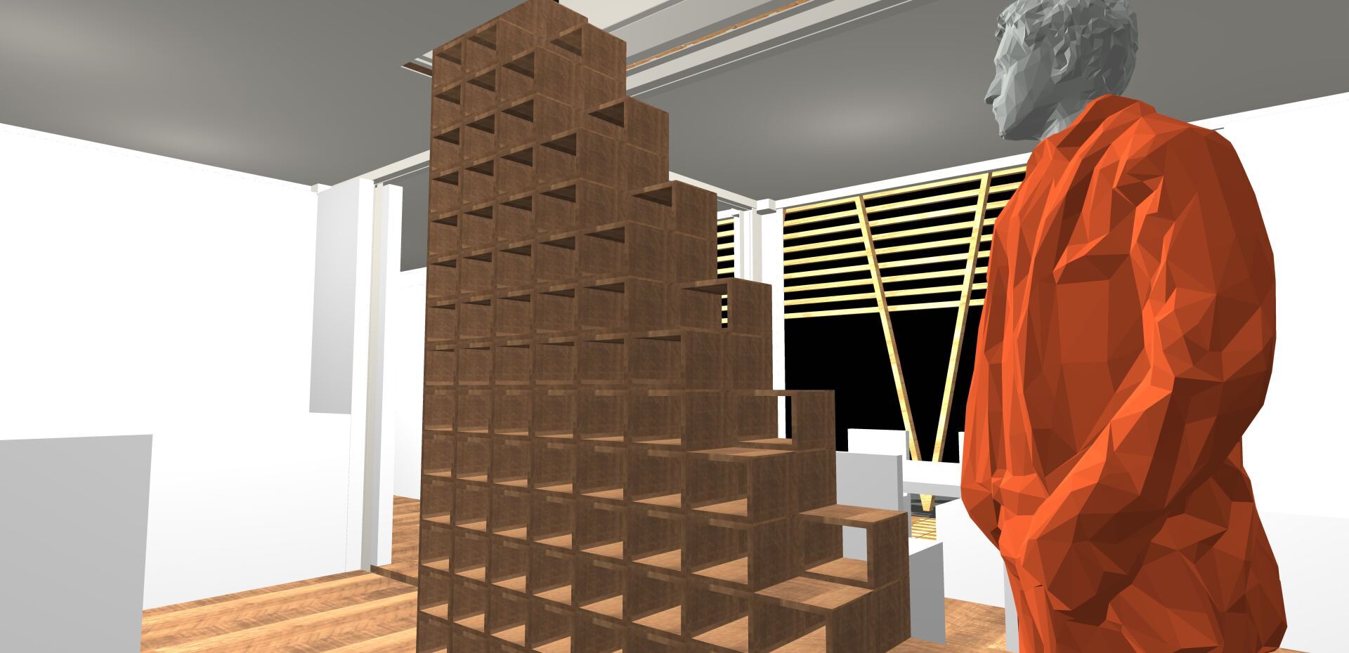 Übergang von der neuen Galerie, Wohnen, Essen und Arbeiten sind in der unteren Ebene, die Zimmer und Bad sind in der oberen Ebene angeordnet, erreichbar über ein Treppenmöbel – eine Sambatreppe die gleichzeitig als Regal nutzbar ist. Die Terrassen sind über einen Screen aus Holzelementen räumlich gefasst und sonnengeschützt.