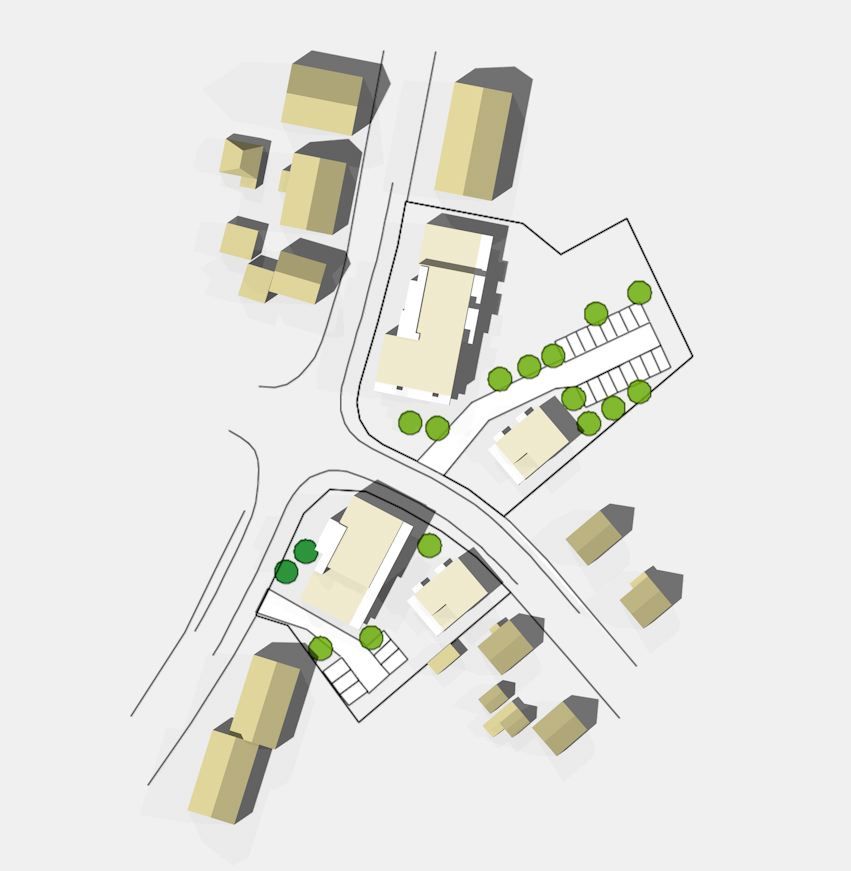 Die Gebäude flankieren beidseitig eine Straßenkreuzung und bilden stadträumlich den Übergang zwischen der Bebauung mit Hochhäusern, Etagenwohnhäusern und Einfamilienwohnhäusern.