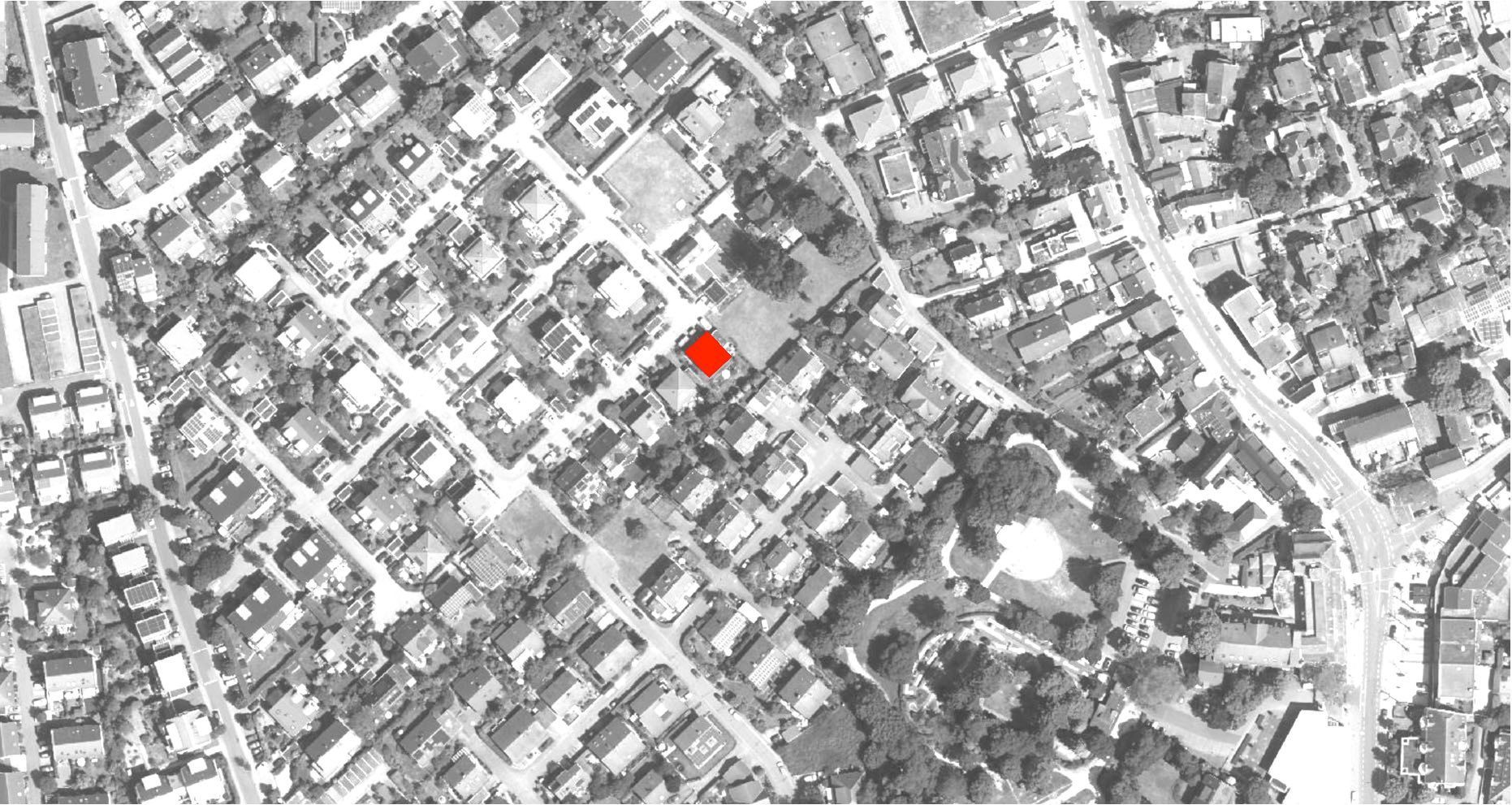 Aus der Zonierung des Grundrisses nach energetischen Erfordernissen ergibt sich die Lage der Aufenthaltsräume auf der Gartenseite, somit orientiert sich die Hauptfassade nach Südosten, ein Balkon verschattet die Fassade im Sommer. Auf der Seite zur Strasse liegt die Servicezone für Technik, Bäder und Abstellbereiche. Die Dachschrägen bleiben innen sichtbar, so ergibt sich für die Räume im Obergeschoss eine grosszügige Raumhöhe. BGF 263 m²