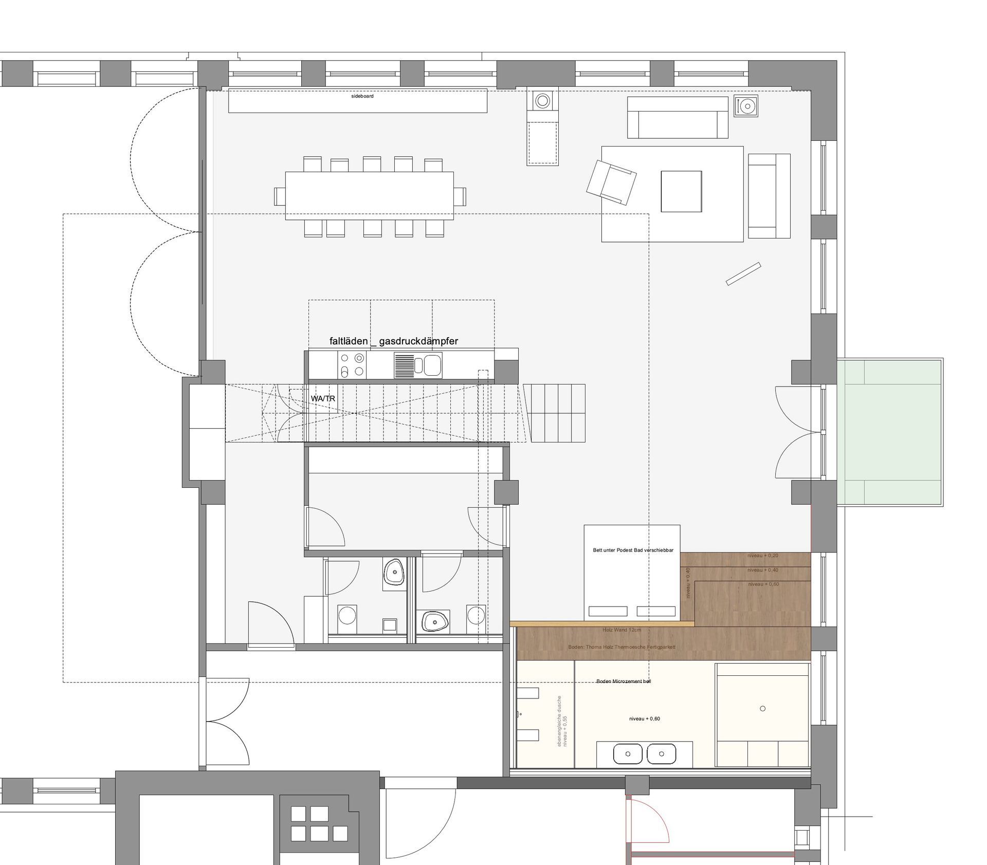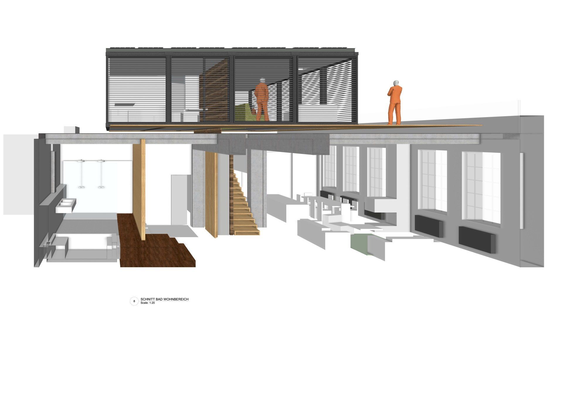 The steel and glass cube on the southern corner of the main building is a new construction made from four converted 40-foot high-cube freight containers with a floor area of 120 m². The well-insulated living space is heated by modern infrared ceiling heating, which draws its energy from photovoltaic elements on the roof of the containers. Automatically controlled external blinds on the façade and the shading of the roof surface by the collectors provide summer heat protection.